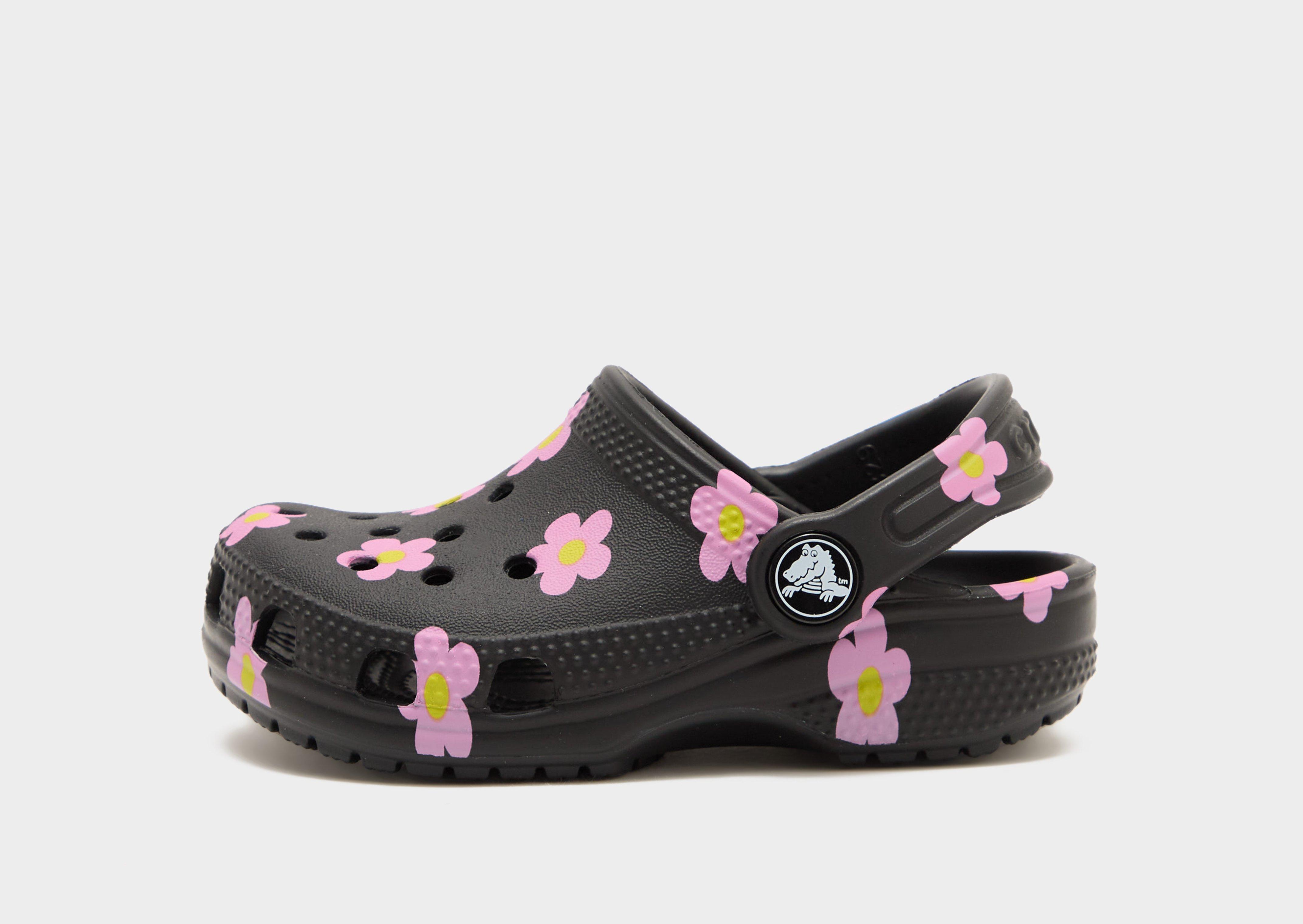 Grab the little one some signature comfort. These infants' Classic Flower Clogs from Crocs have a light and durable Croslite upper. With a pivoting heel strap for a custom fit, they have breathable portholes for ventilation and a textured outsole for traction. Finished with all-over flower branding. Please note: Crocs fit wide. If you have narrow feet, we recommend that you size down. Crocs come with the US size embossed to the sole.
