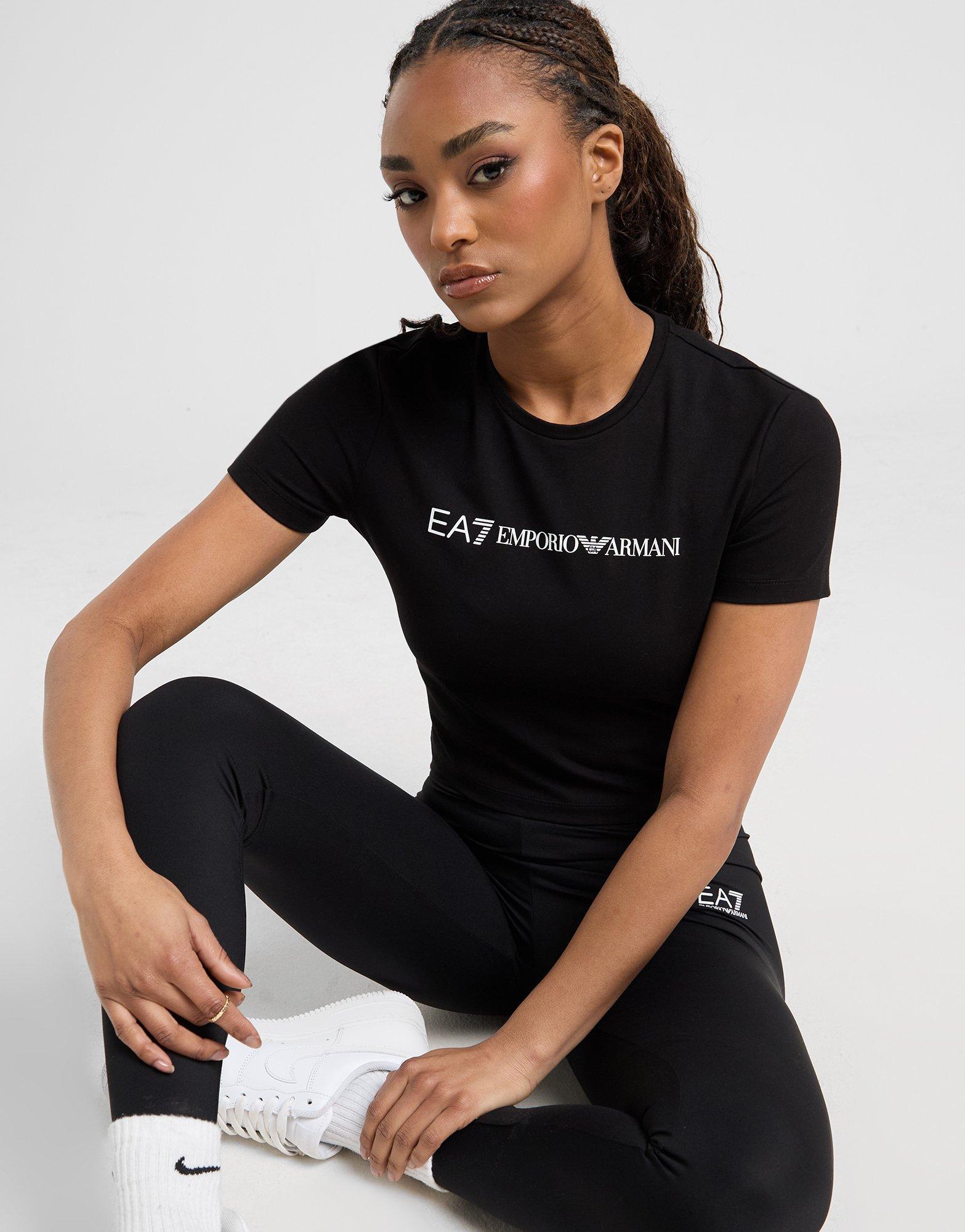 Rep some JD-exclusive style with this women's Logo Slim Crop T-Short from EA7 Emporio Armani. In a Black colourway, this cropped tee us cut from stretchy cotton fabric for lasting comfort. It features a ribbed crew neckline and short sleeves for easy wear and is signed off with EA7 Emporio Armani branding on the nape and chest. Machine washable. | Our model is 5'7" and wears a size S.
