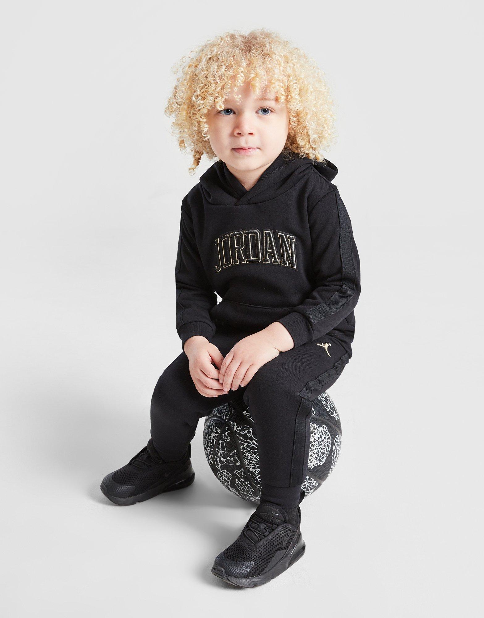Suit 'em up in style with this children's Jersey Patch Hooded Set from Jordan. In a Black and Gold colourway, this standard fit suit is cut from soft fleece fabric for total comfort. It features a pullover hood for custom coverage, with ribbed trims to hold the shape, while the matching joggers have an elasticated waistband for relaxed fit. It has side pockets and a kangaroo pouch for their essentials and is finished up with signature Jordan branding. Machine washable.