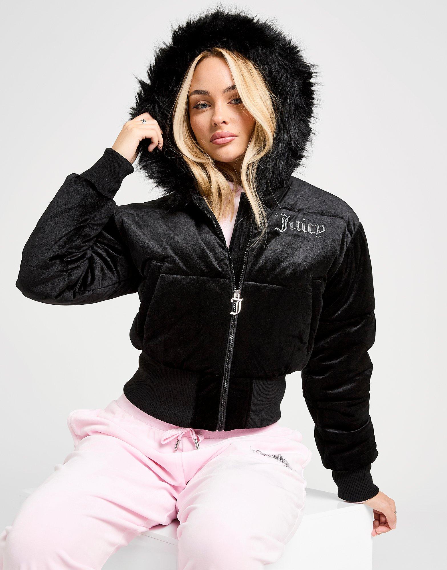Exclusive to JD. Winter, but make it Y2K. This women's Diamante Velour Padded Jacket from Juicy Couture has you covered in cold weather. In black, this plush velour jacket has a synthetic fill for cosy warmth. It's got a sleek cropped hem and ribbed trims to secure the fit. A zip fastening and faux fur-trimmed hood keep you covered. Finished with signature diamante Juicy Couture branding. | Our model is 5'7" and wears a size S.