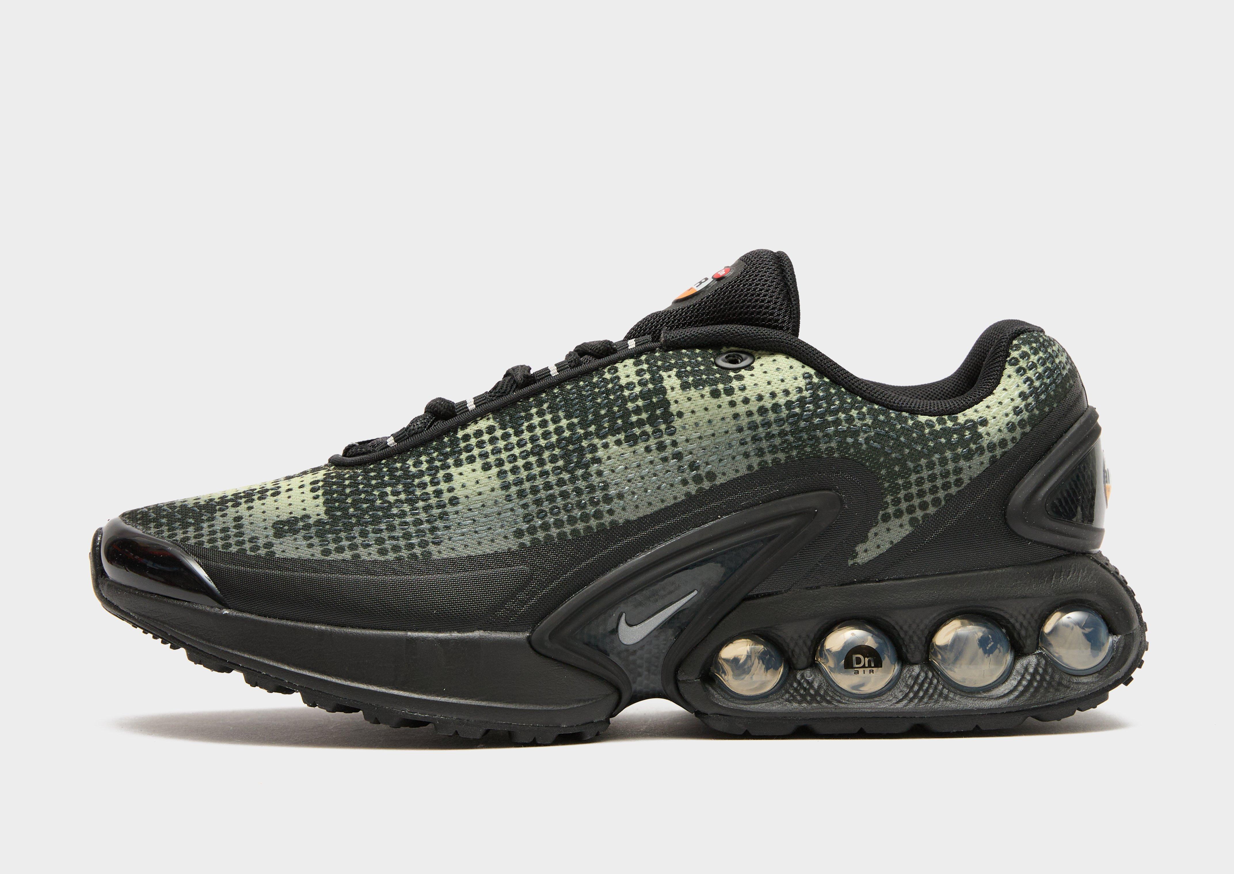 Elevate your rotation with these men's Air Max Dn trainers by Nike. In a Black colourway with an Olive Aura camo-style pattern through the upper, these sneaks have a multi-layered mesh construction, with an all-over haptic print for extra texture. They feature a tonal lace closure with soft padding around the ankle collar for a locked-in fit, and sit above two sets of dual-pressure Air tubes for responsive cushioning with every step. With a tough rubber outsole underfoot for traction, they're finished with signature Nike branding.