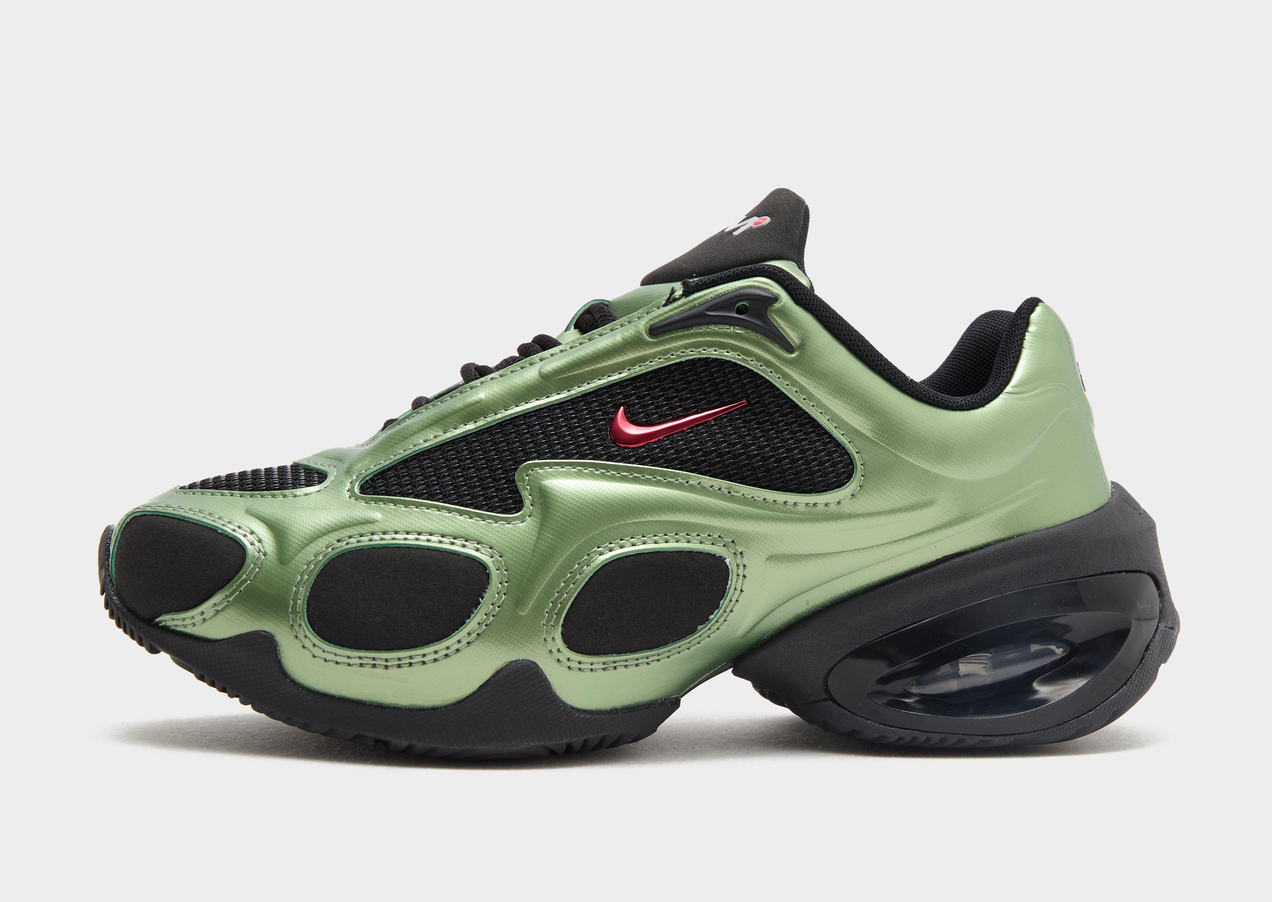 Go bold in the future of Air. These women's Air Max Muse trainers from Nike bring big attitude to your rotation. In an Oil Green and Black colour combo with University Red details, these creps have a lightweight mesh upper with synthetic layers for a textured look. A thick foam midsole and Max Air cushioning delivers unreal comfort. The rubber outsole keeps you gripped. Signed off with iconic Nike branding.