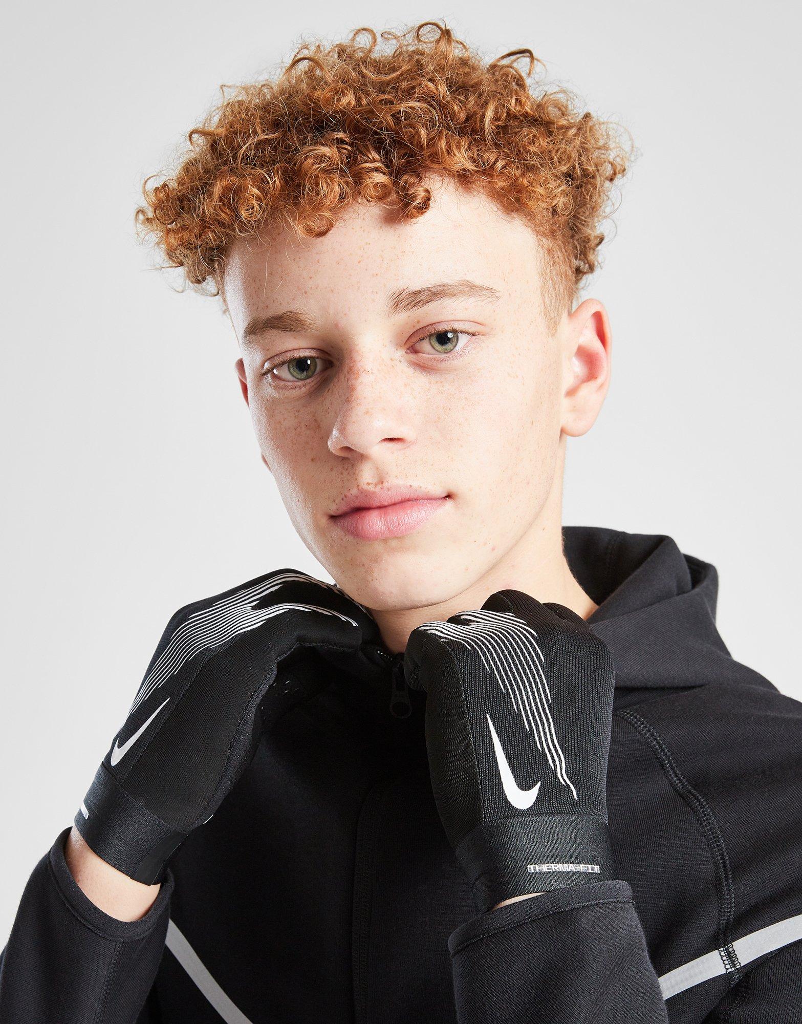 Perform at your best whatever the weather throws at you with these juniors' Nike Therma-FIT Gloves. In a Black colourway with White accents, these gloves are made from a poly blended fabric with Therma-FIT tech to keep your hands warm when the temp drops. They have textured palms to improve your grip, with flexible cuffs for a secure fit. Finishing up, they're signed off with the signature Swoosh logo. Machine washable.