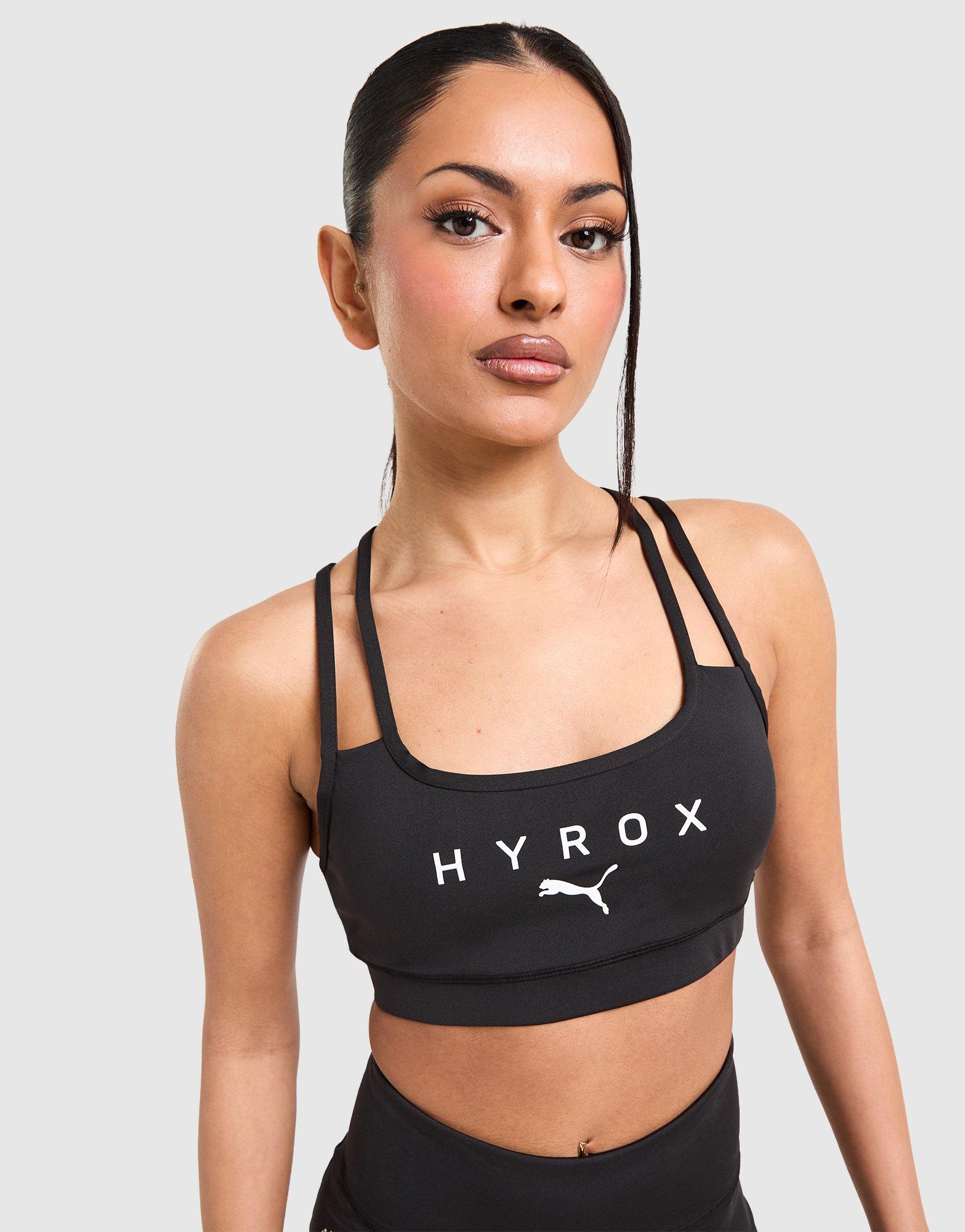 Made for moving, this women's PUMA x HYROX MOVE Strappy Sports Bra is smooth and stretchy. dryCELL technology wicks away sweat. Removable padding means you can find your fit, and a sleek strappy design looks fresh. Finished with PUMA x HYROX branding. Machine washable. | Our model is 5'7" and wears a size S.