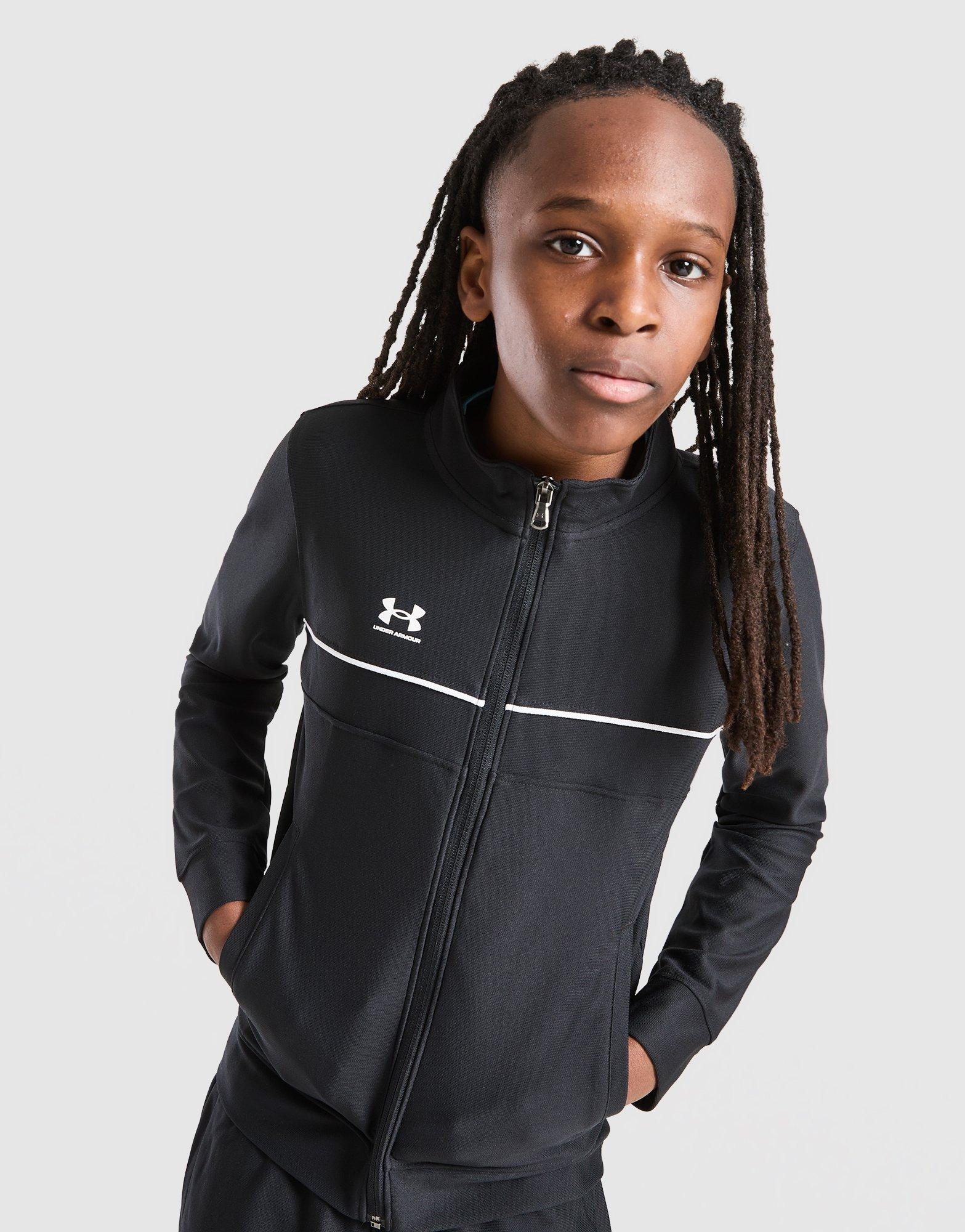 On and off the pitch, this juniors' Challenger Track Top from Under Armour is a go-to. In black, this standard-fit layer is made from textured knit fabric that wicks away sweat to keep you cool and dry. It features a full zip fastening and a risen collar. With side pockets, this track top is finished up with contrasting piping and signature Under Armour branding. Machine washable.