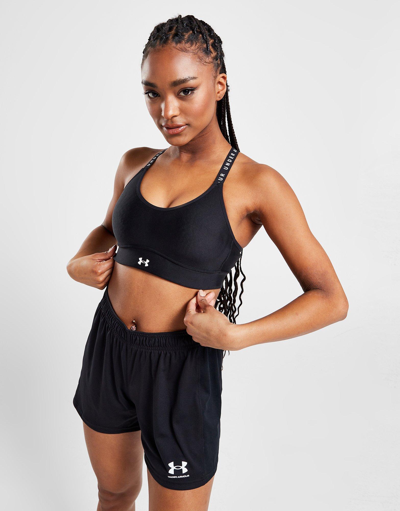 Cop a workout essential with this women's Infinity Bra from Under Armour. Coming in a Black colourway, this slim-fit sports bra is made with a super-smooth, lightweight HeatGear fabric with added stretch so you can move easily. Equipped with sweat-wicking tech and breathable mesh to keep you cool, it features adjustable crossover straps and a hook-and-loop back clasp for a secure fit. The molded, PU-injected one-piece pad delivers strategic support to your workouts, designed for miedium-level activities like boxing, cycling and weight training. Finished up with signature Under Armour branding. Machine washable. | Our model is 5'7" and wears a size small.