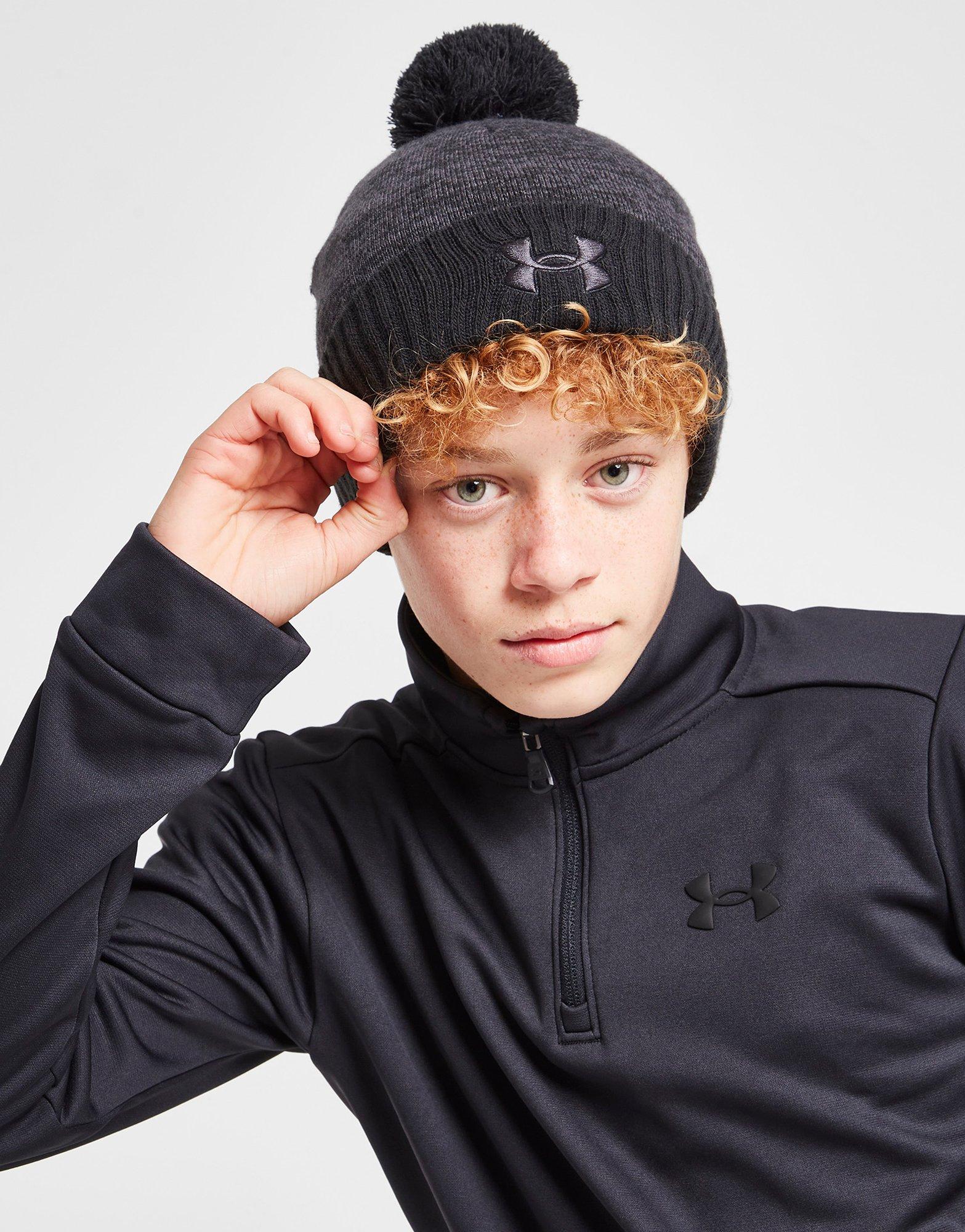 Level up your winter accessories with this juniors' Logo Pom Beanie Hat from Under Armour. In a Grey and Black colourway, this beanie is cut from soft, stretchy acrylic knit for cosy comfort. It features an up-turned cuff, with a pom to the crown and is signed off the with the signature Under Armour logo to the front. Machine washable.