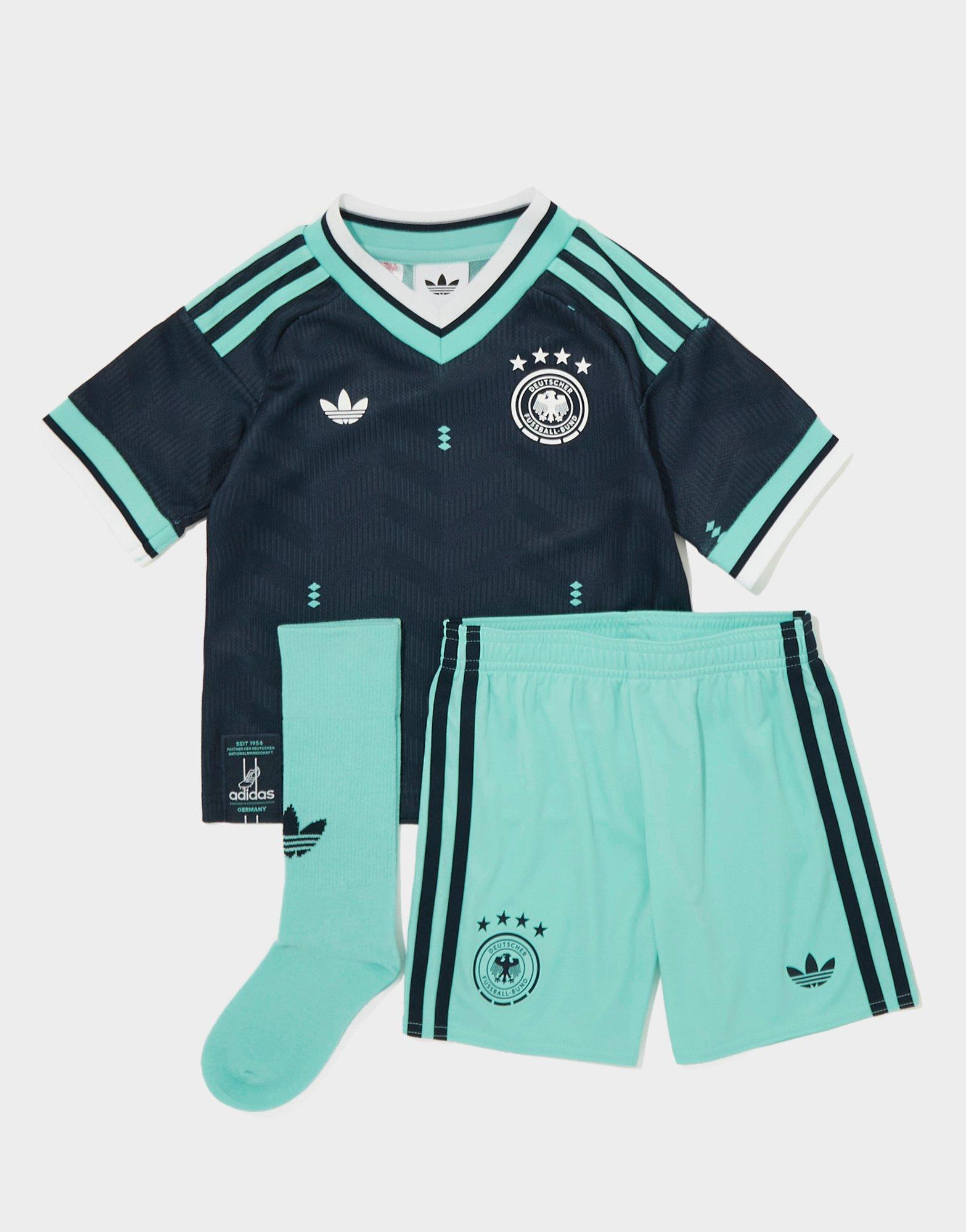 Get the little one ready for matchday. This children's Germany 2026 Away Kit from adidas Originals takes cues from iconic moments on the pitch. It features a V-neck shirt and shorts, with built-in CLIMACOOL tech to wick away sweat. Landing in Collegiate Navy, it's finished with Trefoil branding, 3-Stripes and the team crest. Machine washable | JZ4571