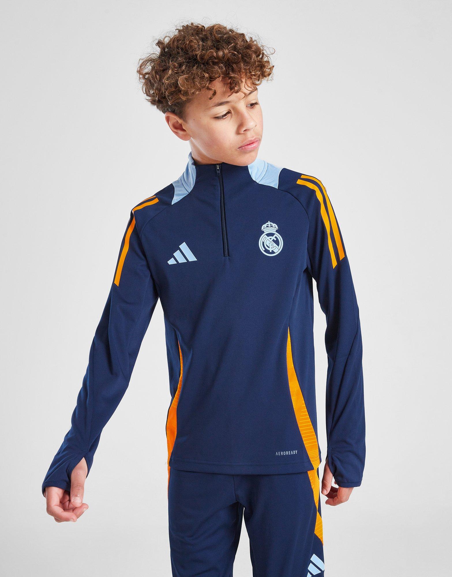 Rep your teams' colours in training with this juniors' Real Madrid Training Top from adidas. In a Navy Blue 2, Crew Orange and Glow Blue colourway, this top is cut from recycled polyester with AEROREADY sweat-wicking tech to keep things cool as you practice your skills. It features a quarter zip fastening with a ribbed stand-up collar to amp up the coverage, with thumbholes on the cuffs to keep you locked in. With the 3-Stripes to the shoulders, it's signed off with the Performance logo and Real Madrid crest to the chest. Machine washable. | JE4208