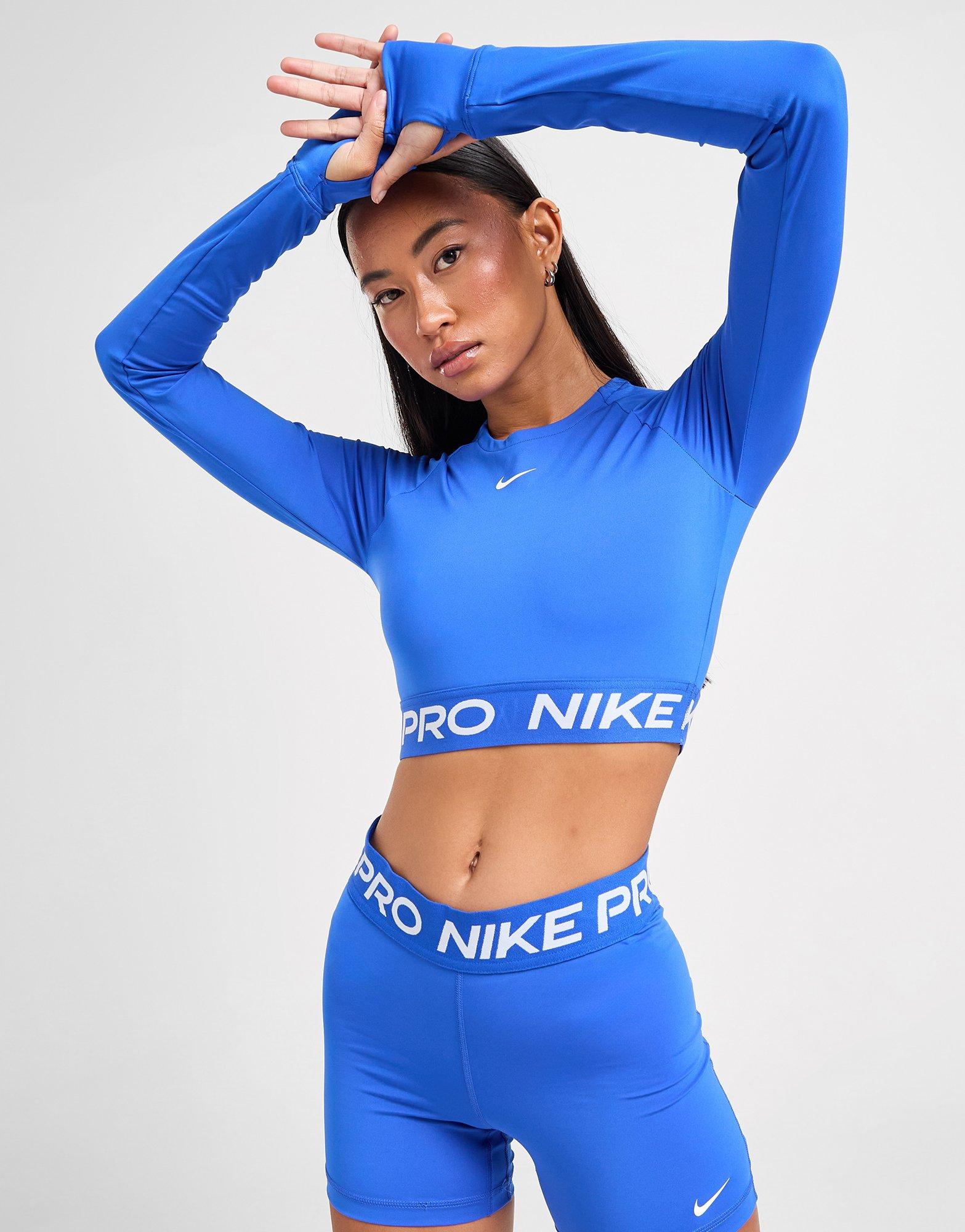 Big style? No sweat. This women's Nike Training Pro Long Sleeve Crop Top drops in Hyper Royal. Dri-FIT tech keeps you fresh and dry, while the stretchy fabric can be held in place at the thumbholes. A cropped hem has oversized Nike Pro branding on it, with a signature Swoosh on the chest. Machine washable. | Our model is 5'7" and wears a size S.