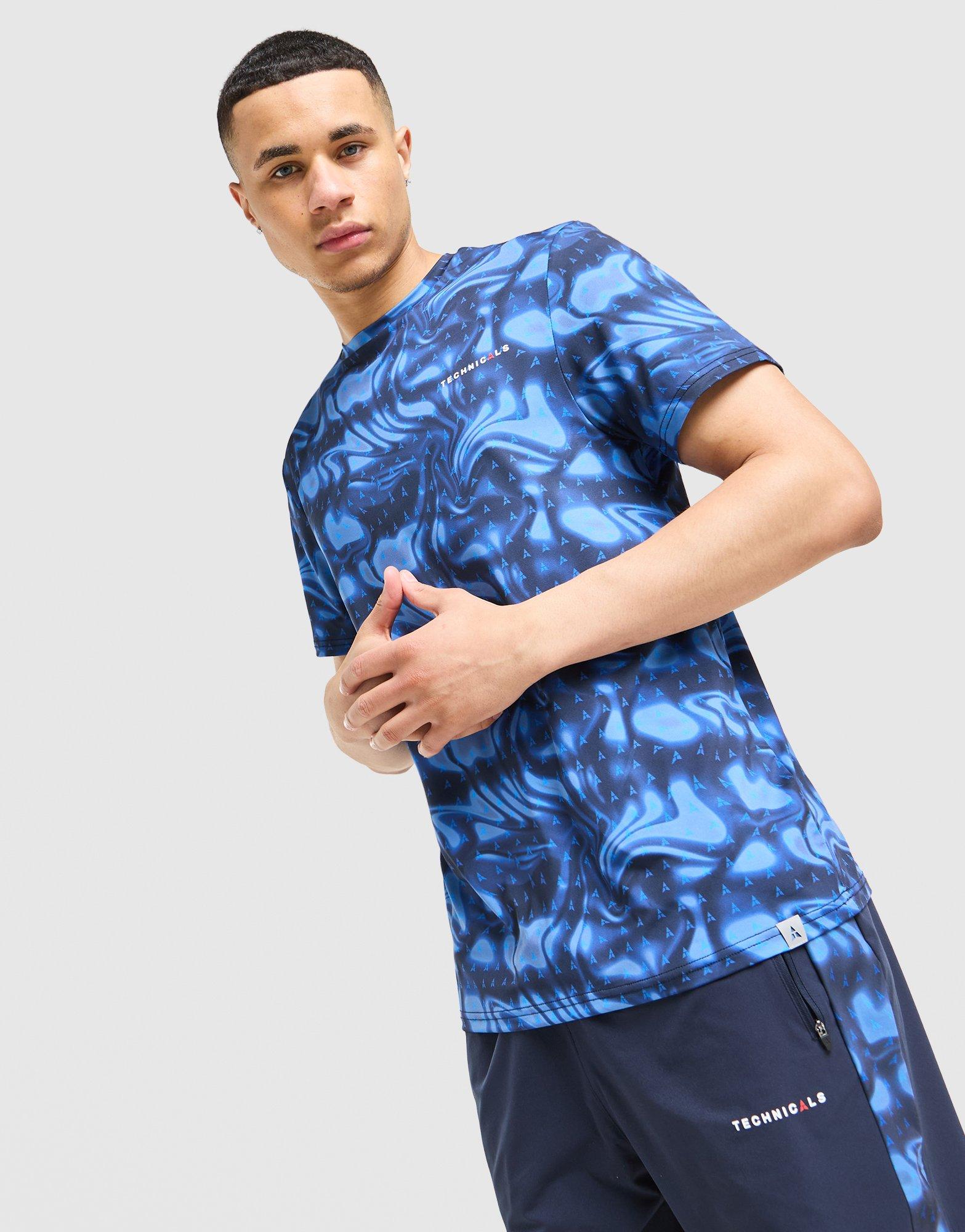 Technicals is bringing big energy to your summer fits. Exclusive to JD, this men's Fells Poly T-Shirt lands in blue with a bold graphic print. It's smooth and light for daily comfort, with a classic crew collar and short sleeves. Finished up with an all-over Technicals logo, and signature branding at the chest. Machine washable. | Our model is 6'0" with a 36" chest and wears a size M.