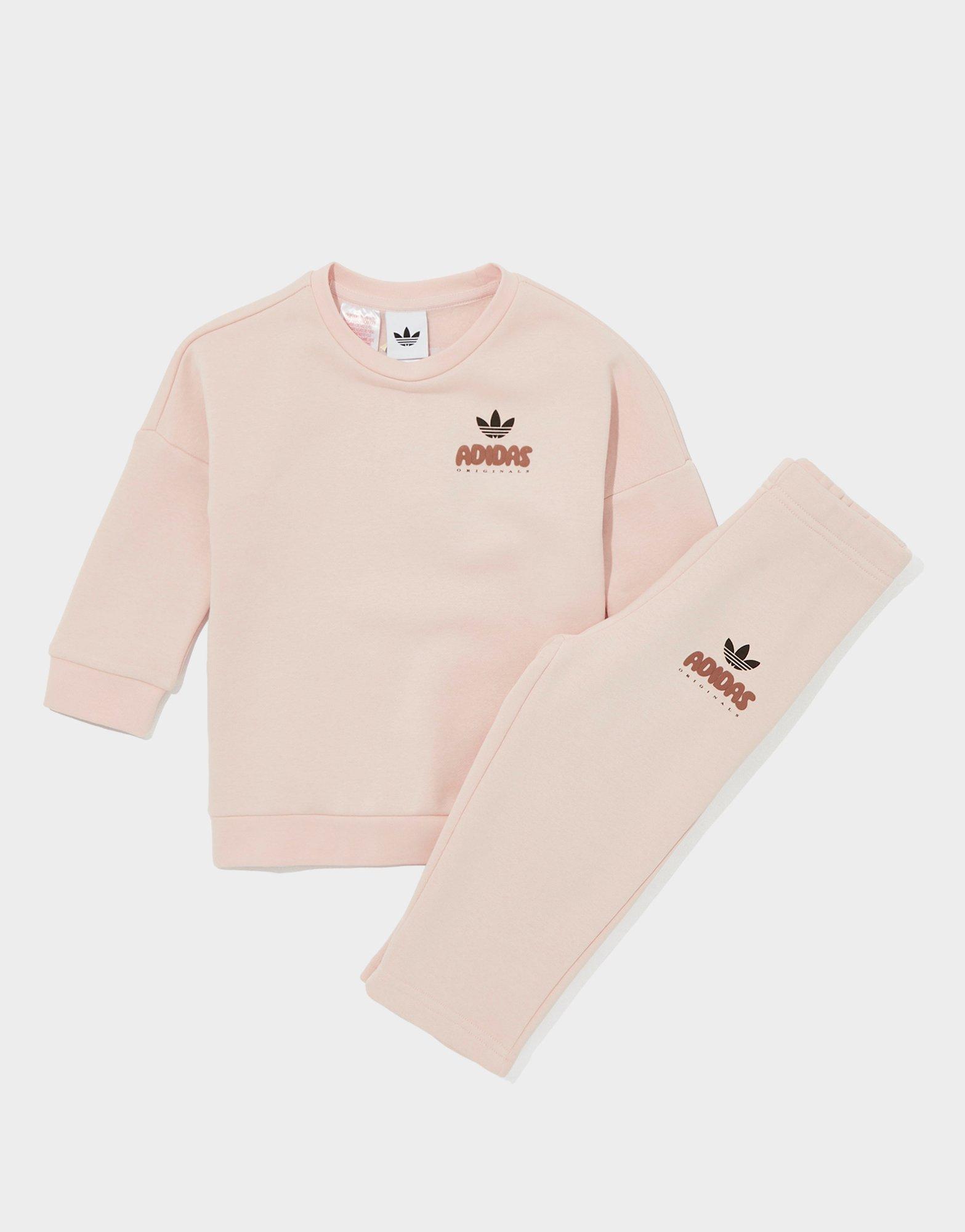 Bag the little one some 3-Stripes heat. This infant girls' Bubble Crew Tracksuit from adidas Originals is exclusive to JD. It features a pullover crew sweatshirt, with matching joggers that have an elastic waist. Landing in Sandy Pink, it's finished with bubble logo branding to the chest and leg. Machine washable | KG7726