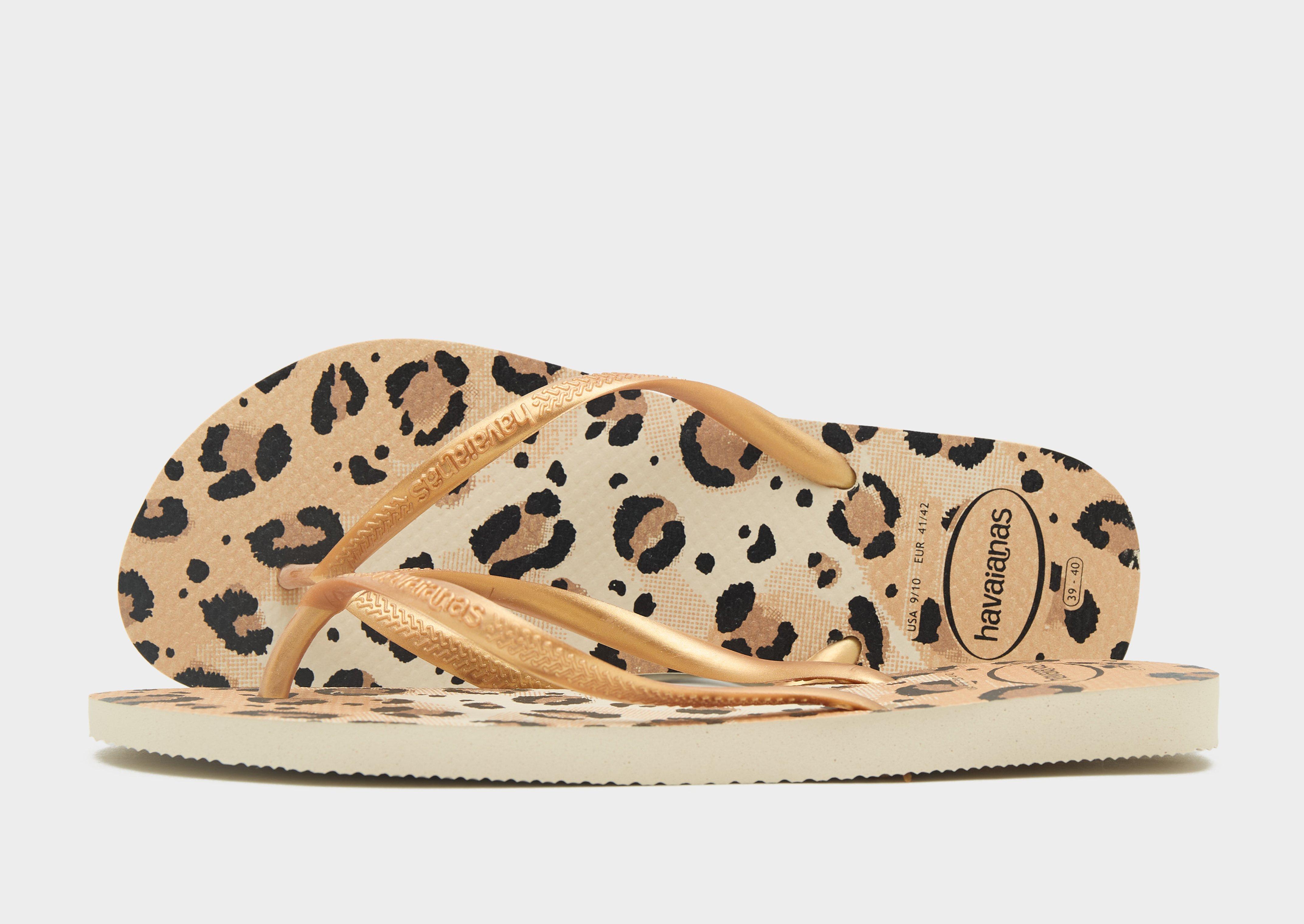 Prep for sunny days with these women's Slim Animal Print Flip Flops from Havaianas. In a Beige colourway with an animal print design, these flip flops are made with smooth, lightweight rubber for lasting wear. With sleek, slim straps and a classic toe thong, they're finished with a textured rubber outsole and signature Havaianas branding.