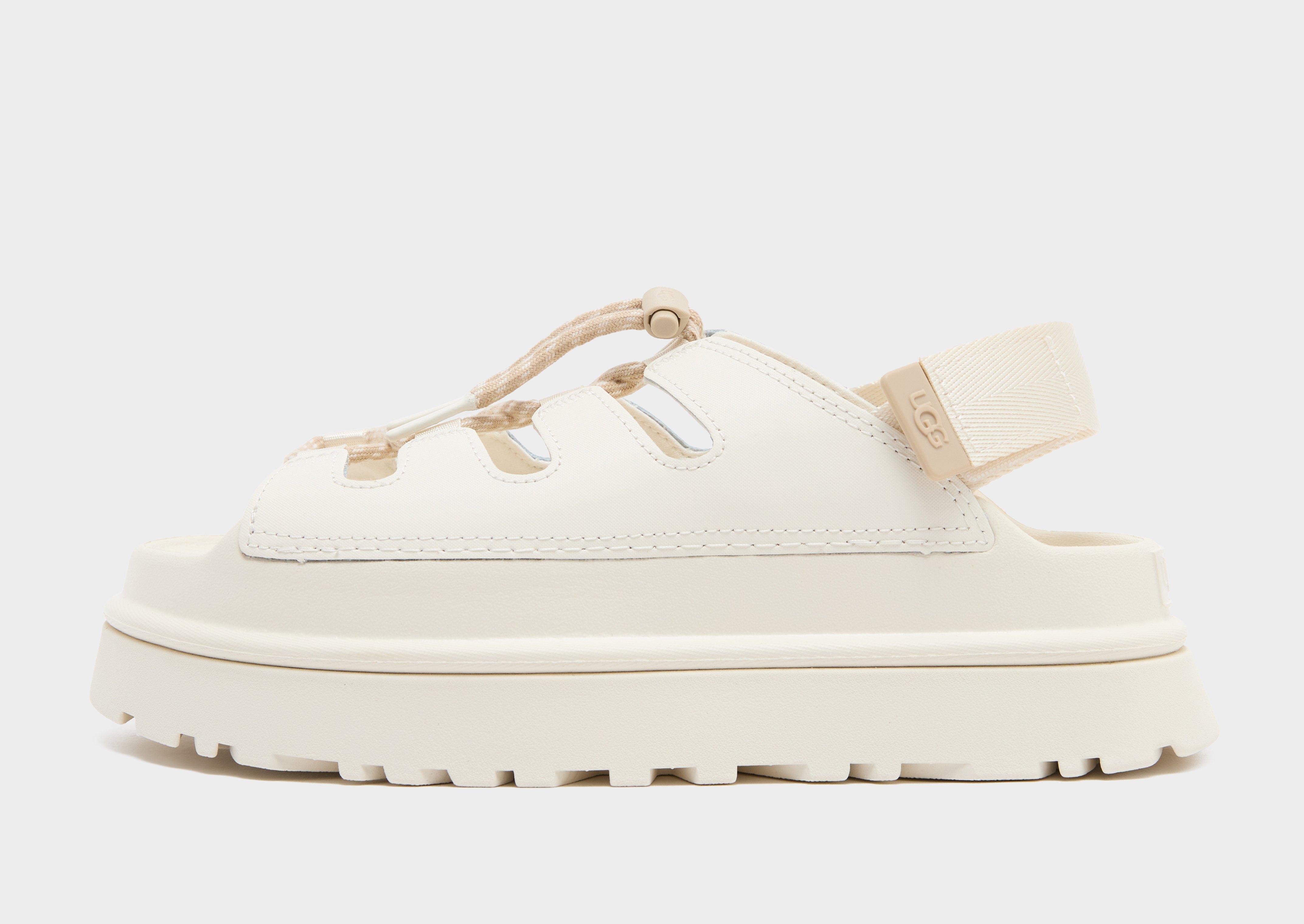Bring the positive energy. These women's Goldenglow Toggle sandals from UGG are cut from smooth, coated PU leather. They have a plastic pull toggle, hook-and-loop fastenings and laces for a secure fit. A sugarcane EVA midsole and outsole bring a smooth ride. Landing in Jasmine, they're finished with signature branding.