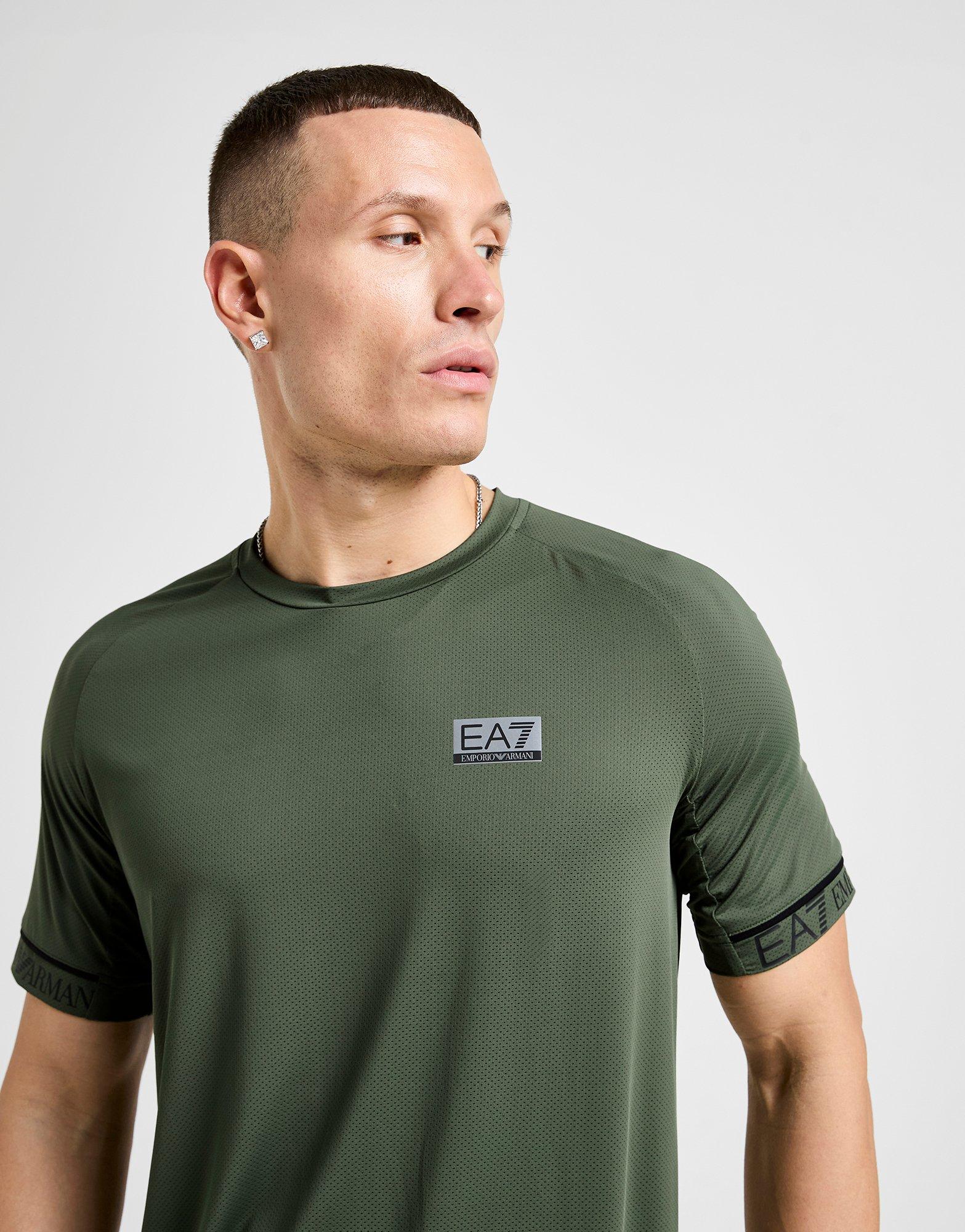 Premium perofrmance and streetwear meet with this men's Tape Sleeve Poly T-Shirt from EA7 Emporio Armani. In a Green colourway, this JD-exclusive tee has a raglan, short sleeves with taped wordmark branding to the cuffs. It's made from a lightweight and breathable polyester mesh fabric. Finished with a reflective EA7 badge on the chest. Machine washable. | Our model is 6'0" with a 39" chest and wears a size M.