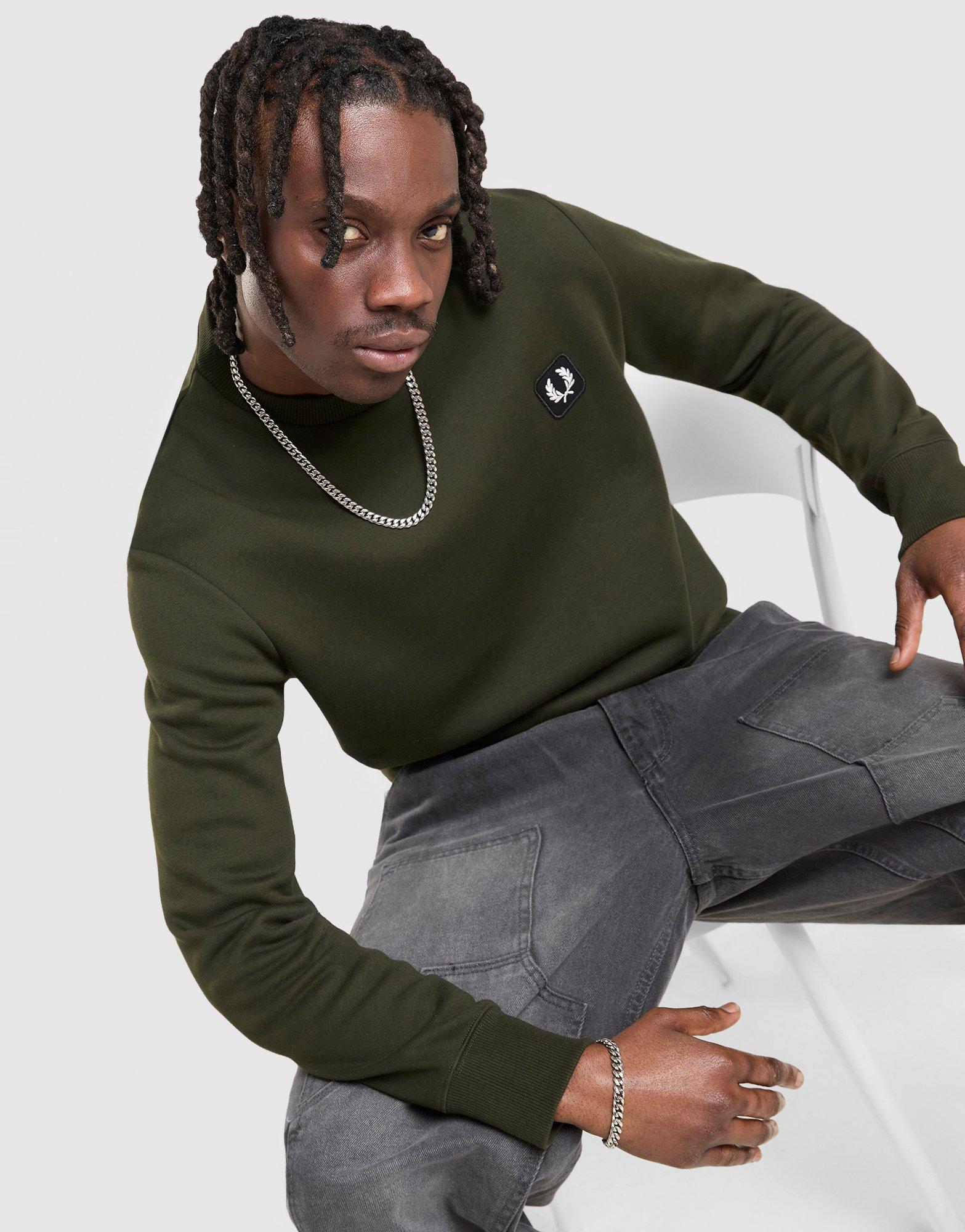 An exclusive hit from Fred Perry. This men's Badge Crew Sweatshirt lands in a Hunting Green colour. Cut from soft fleece, it's got a classic crew neckline and ribbed trims for a clean look. Finished with a Laurel Wreath badge to the chest. Machine washable. | Our model is 6'0" with a 35" chest and wears a size M.