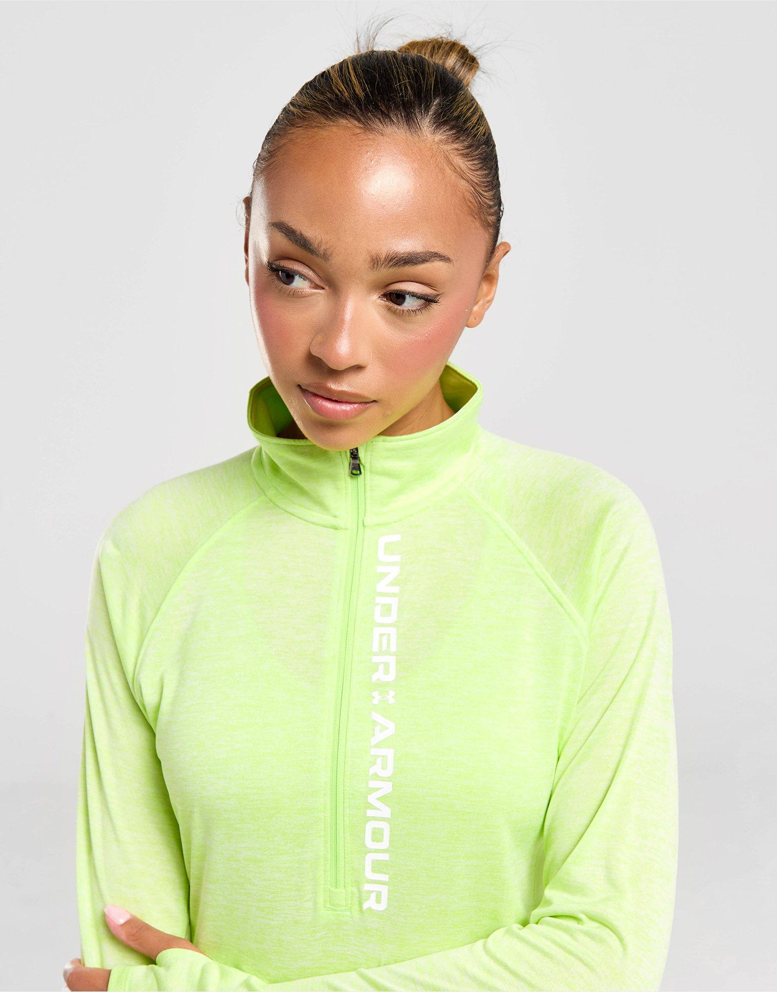 Exclusive to JD. Hit the gym in style with this women's UA Tech 1/2 Zip Top from Under Armour. In a Green colourway, this standard fit top is made from smooth UA Tech fabric that's lightweight, breathable and wicks away sweat. It has a stand-up collar and 1/2 zip fastening for coverage and thumbholes on the cuffs to hold the sleeves in place. Finished off with Under Armour wordmark branding down the front and the signature logo on the nape. Machine washable. | Our model is 5'8" and wears a size small.