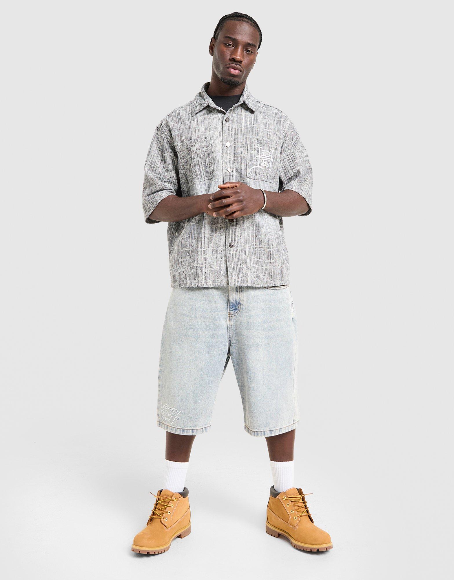 Keep it classic in this men's Ed Hardy Thread Shirt. In grey, shirt is made with a textured cotton fabric. With a button-down fastening and a flat collar, it's got short sleeves and a boxy cut for a chilled vibe. Finished up with two chest pockets and Ed Hardy branding. Machine washable. | Our model is 6'1" with a 36" chest and wears a size M.