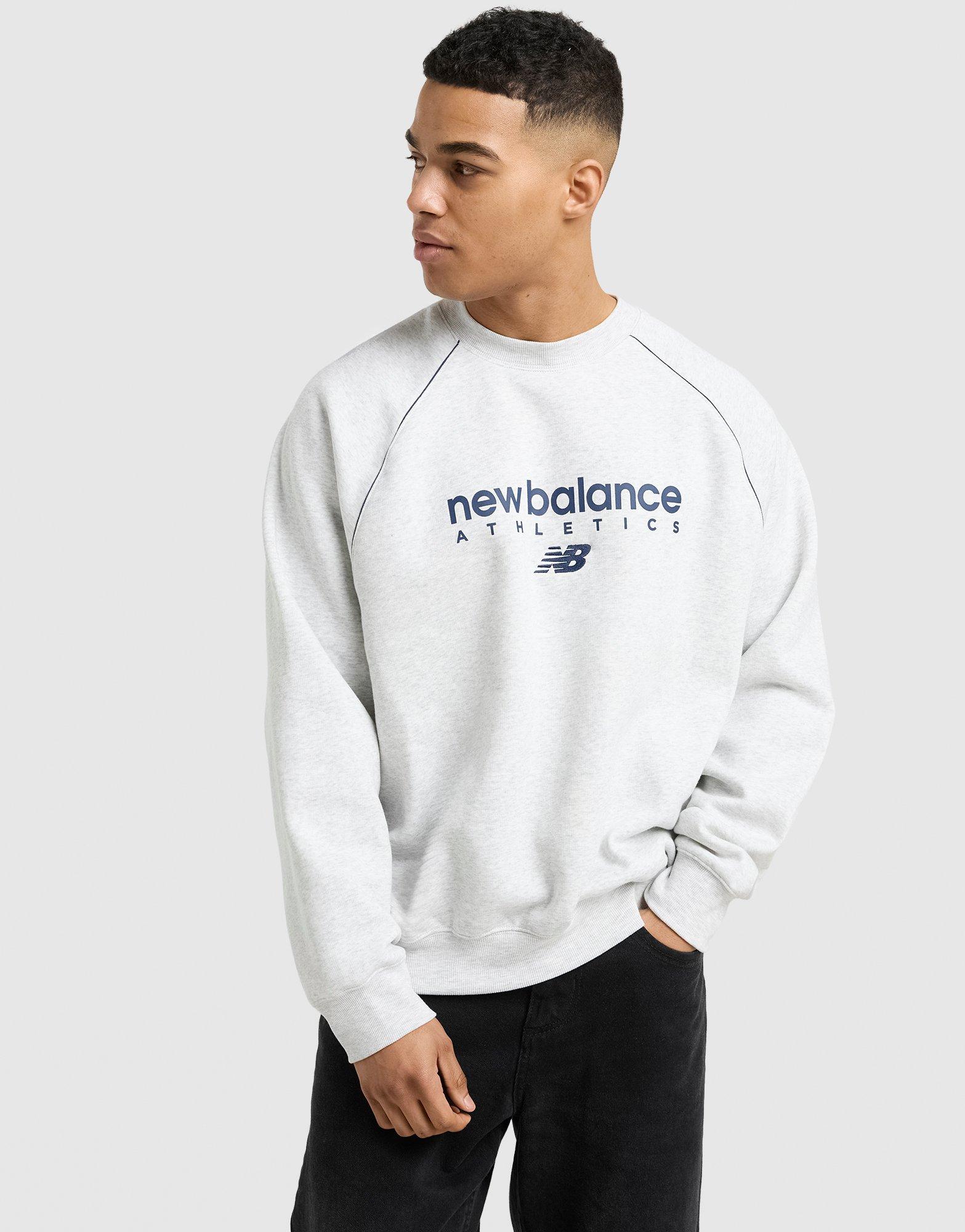Athletic-inspired style from New Balance. This men's Trackside Piping Crew Sweatshirt is cut from super-soft fleece in grey marl. Inspired by retro track energy, it's got sporty pipe detailing and raglan-cut sleeves. It's got ribbed trims to secure the oversized fit, and is signed off with iconic New Balance branding to the chest. Machine washable. | Our model is 6'1" with a 39" chest and wears a size M.
