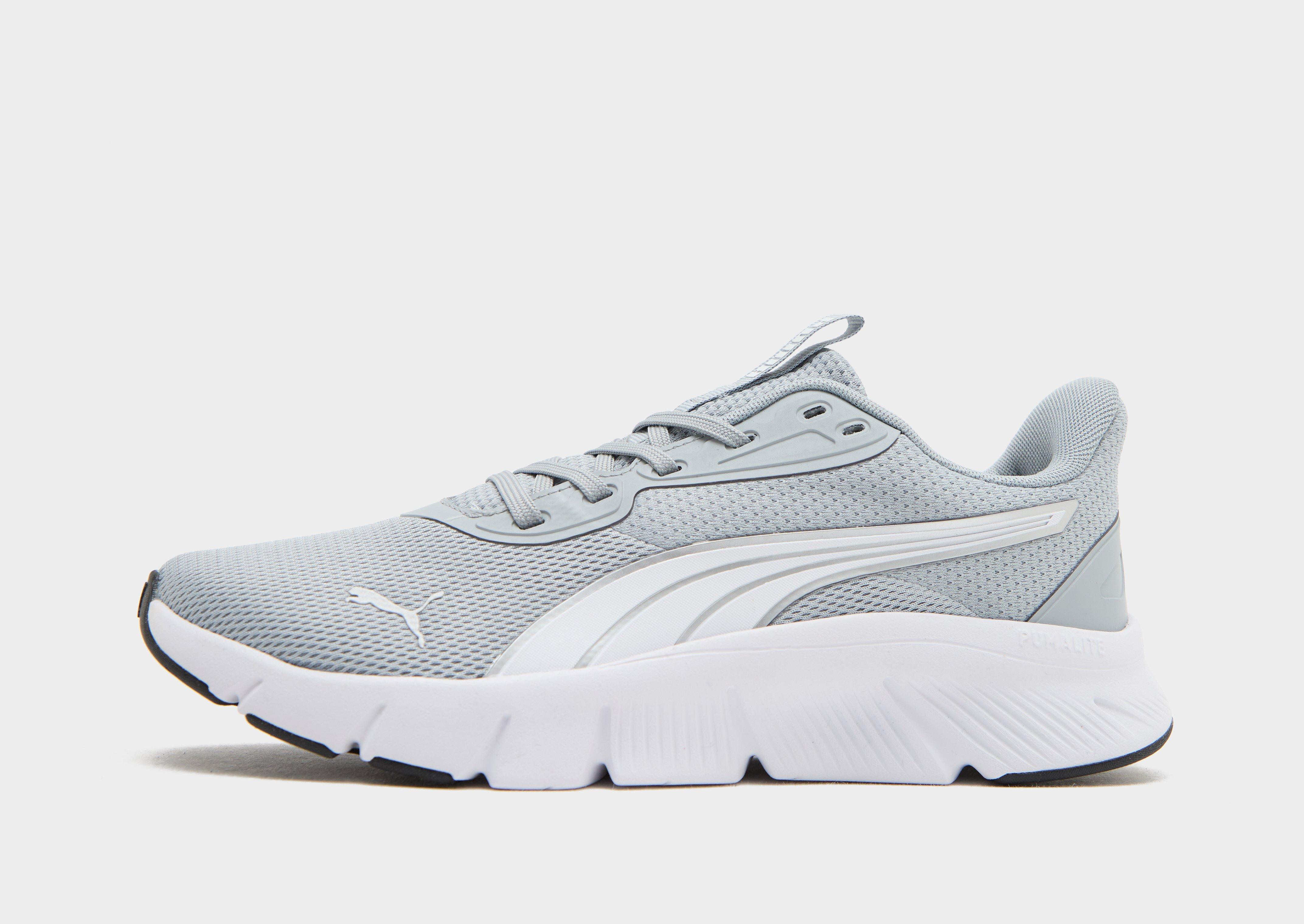 Running-ready. JD-exclusive. These juniors' Flex Focus running shoes from PUMA have a breathable mesh and synthetic. The padded collar brings support. Pull-tabs offer easy access. Underfoot, a chunky PUMALite midsole brings spring and bounce. Grippy rubber adds firm traction. They land in grey and white with classic PUMA branding.