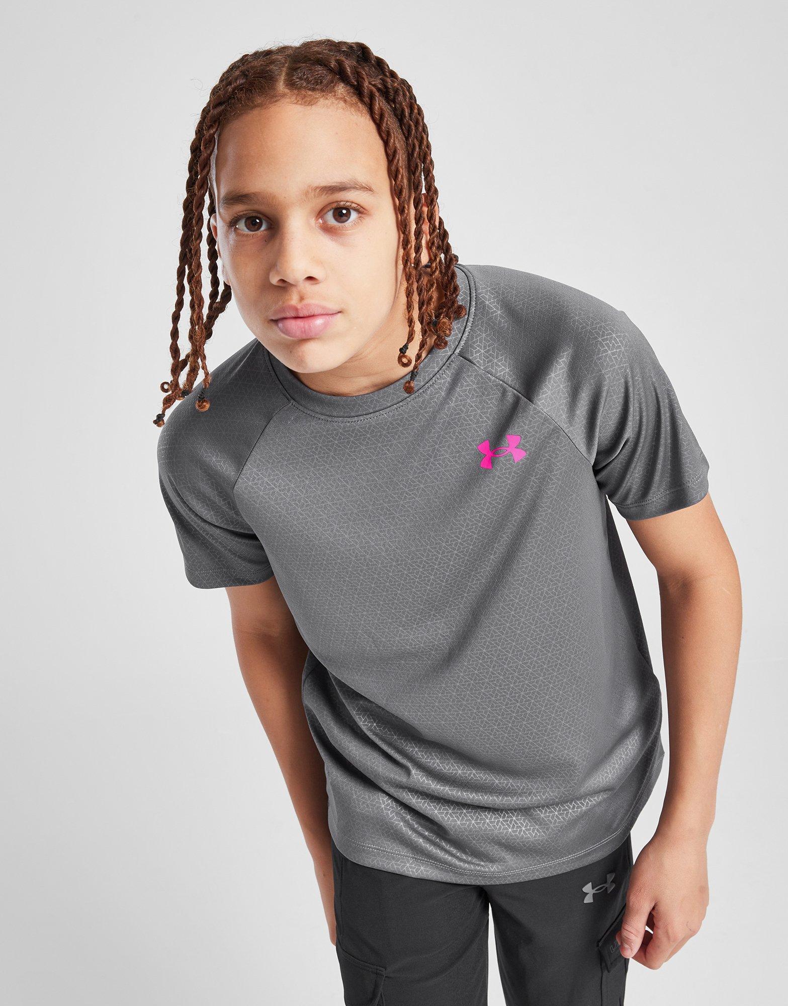 Chase your goals in this juniors' Emboss T-Shirt from Under Armour. In a Grey and Pink colourway, this JD-exclusive tee is cut from lightweight polyester for cool comfort. It features short sleeves with a ribbed crew neckline and is equipped with UA Tech to remove sweat. Finished up with classic Under Armour branding. Machine washable.