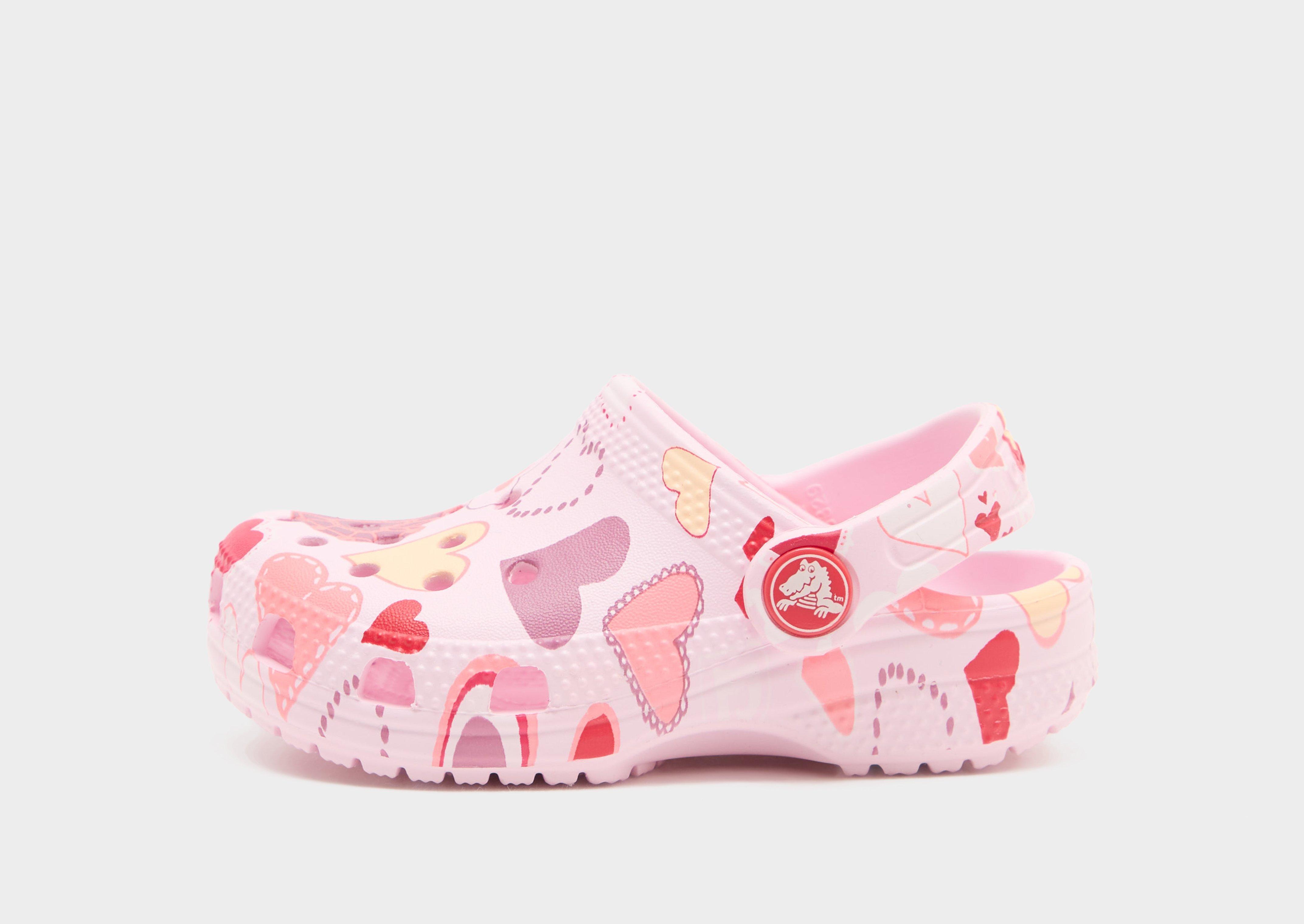 Big comfort lands on little feet. These infant's Classic Clogs from Crocs get a Valentine's edit. In Pink Milk, they're cut from light, waterproof Croslite foam with heart lollipop graphics. They've got breathable vent ports to keep things cool, with a pivoting heel strap to adjust the fit. A foam footbed is there to amp up the comfort. And a rubber outsole offers grippy traction. Crocs branding finishes things up. Note: Crocs fit wide. If you've got wide feet, try sizing down. Crocs have the US size on the sole.