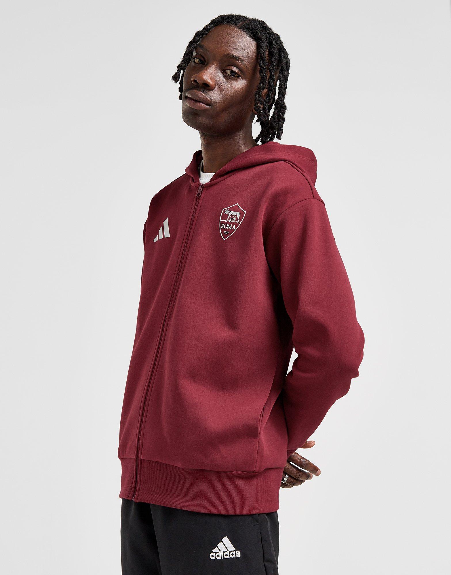 Layer up and stay covered with this men's AS Roma Anthem Jacket from adidas. In a Team College Burgundy colourway, this standard fit jacket is cut from soft fleece fabric that partly uses recycled polyester. It features a full-zip fastening and hood for custom coverage, with ribbed trims to hold the shape and side pockets for easy storage. Finished up with the AS Roma crest and Performance logo to the chest. Machine washable | Our model is 6'0" with a 35" chest and wears a size medium. | IT3868