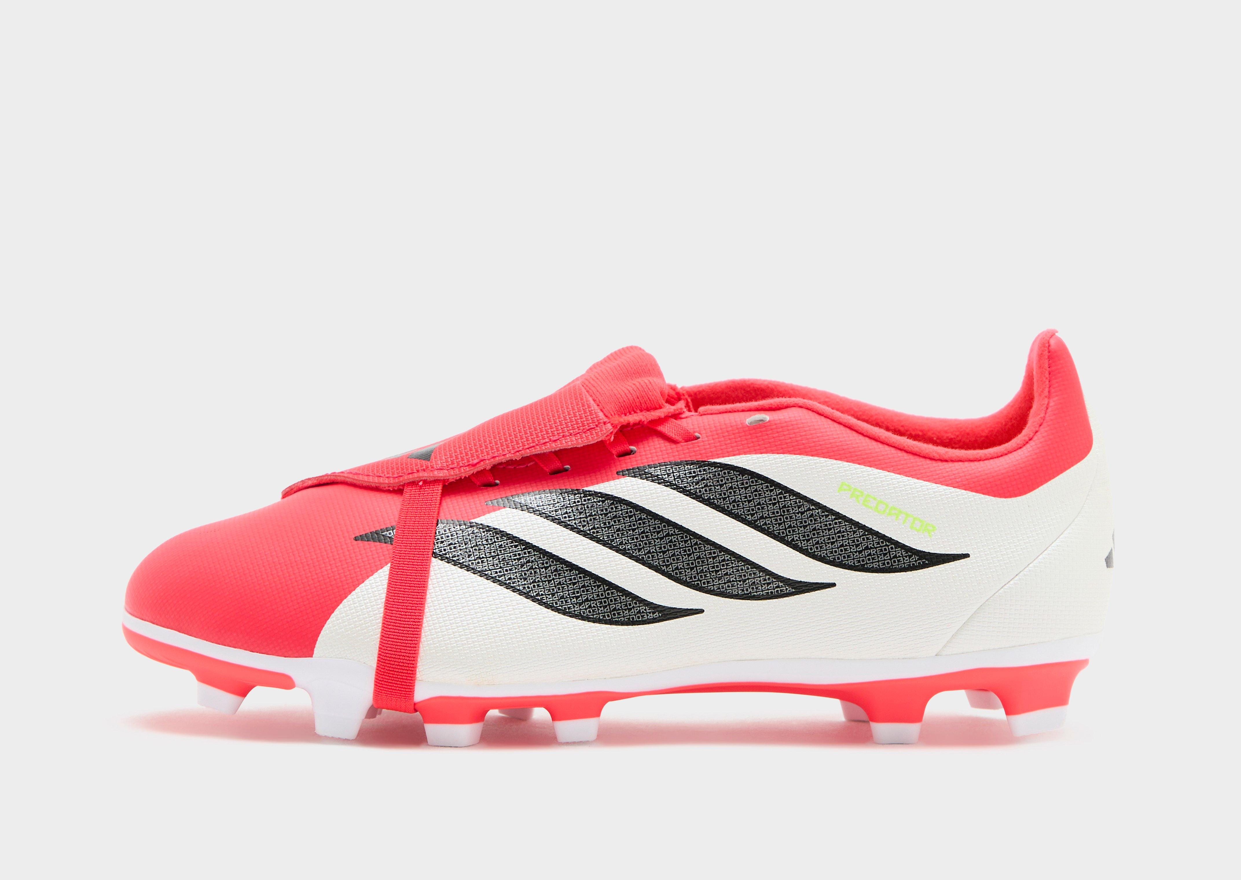 Give yourself the edge. These juniors' Predator Club Fold-Over Tongue FG football boots from adidas have a durable synthetic and mesh upper for close control and accuracy. The fold-over tongue offers a smooth strike zone for clean hits and powerful shots. Underfoot, molded studs bring traction and acceleration on firm ground. They land in Lucid Red, Core Black and Footwear White, with signature branding. | KI8894