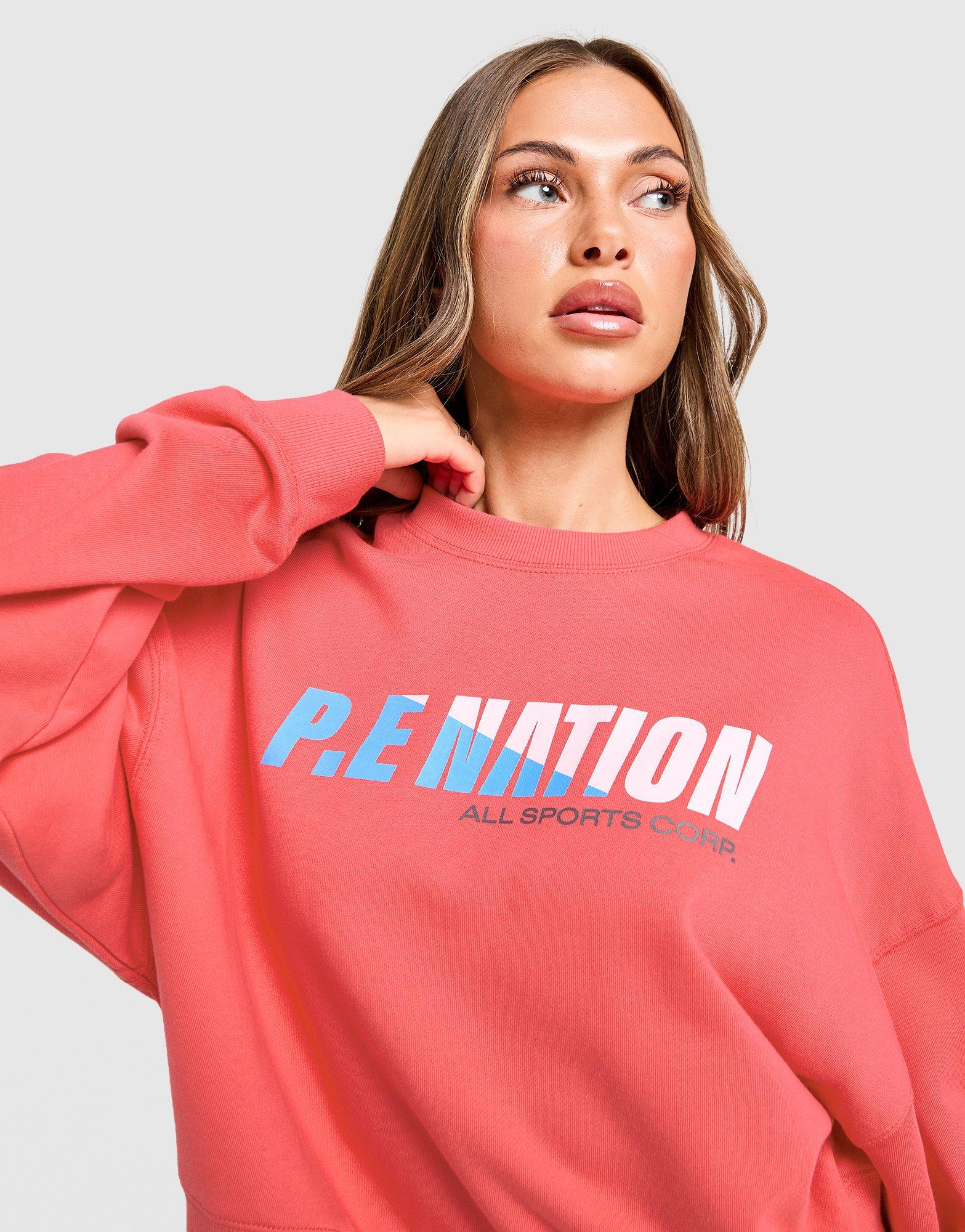 Layering season, levelled up. This women's Arena Crew Sweatshirt from PE Nation is cut from soft red cotton. An oversized fit with drop-shoulder sleeves is held secure with sleek ribbed trims. Finished with a bold PE Nation graphic across the chest. Machine washable. | Our model is 5'7" and wears a size S.