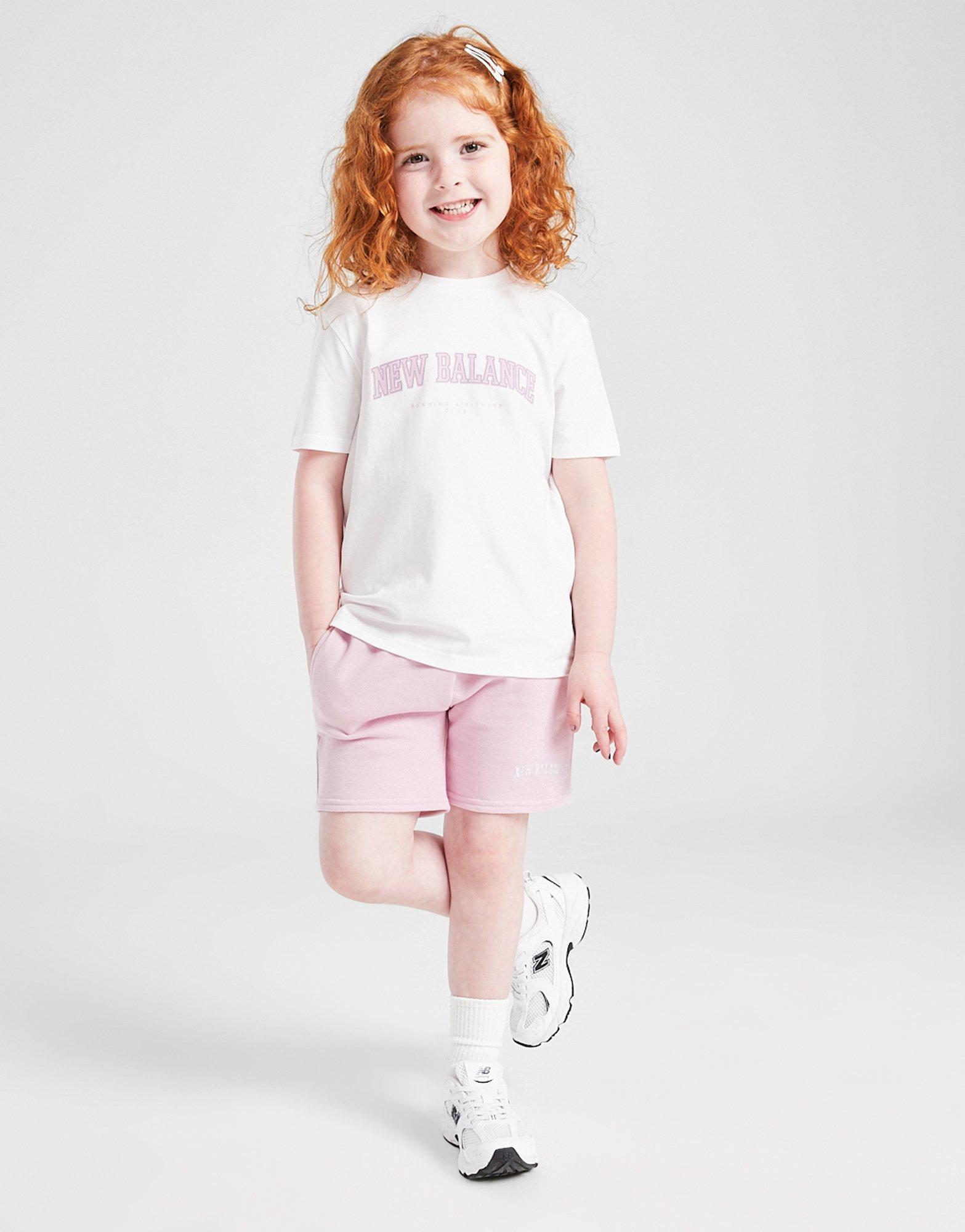 Get your little one ready for the sun with this children's Arch Logo T-Shirt and Shorts Set from New Balance. Exclusive to JD, this downsized set has a White crewneck tee with short sleeves, while the Pink shorts feature side pockets and a drawcord tie to the elastic waistband. Made from a soft cotton blend, it's finished off with arched New Balance branding on the chest and to the left leg. Machine washable.