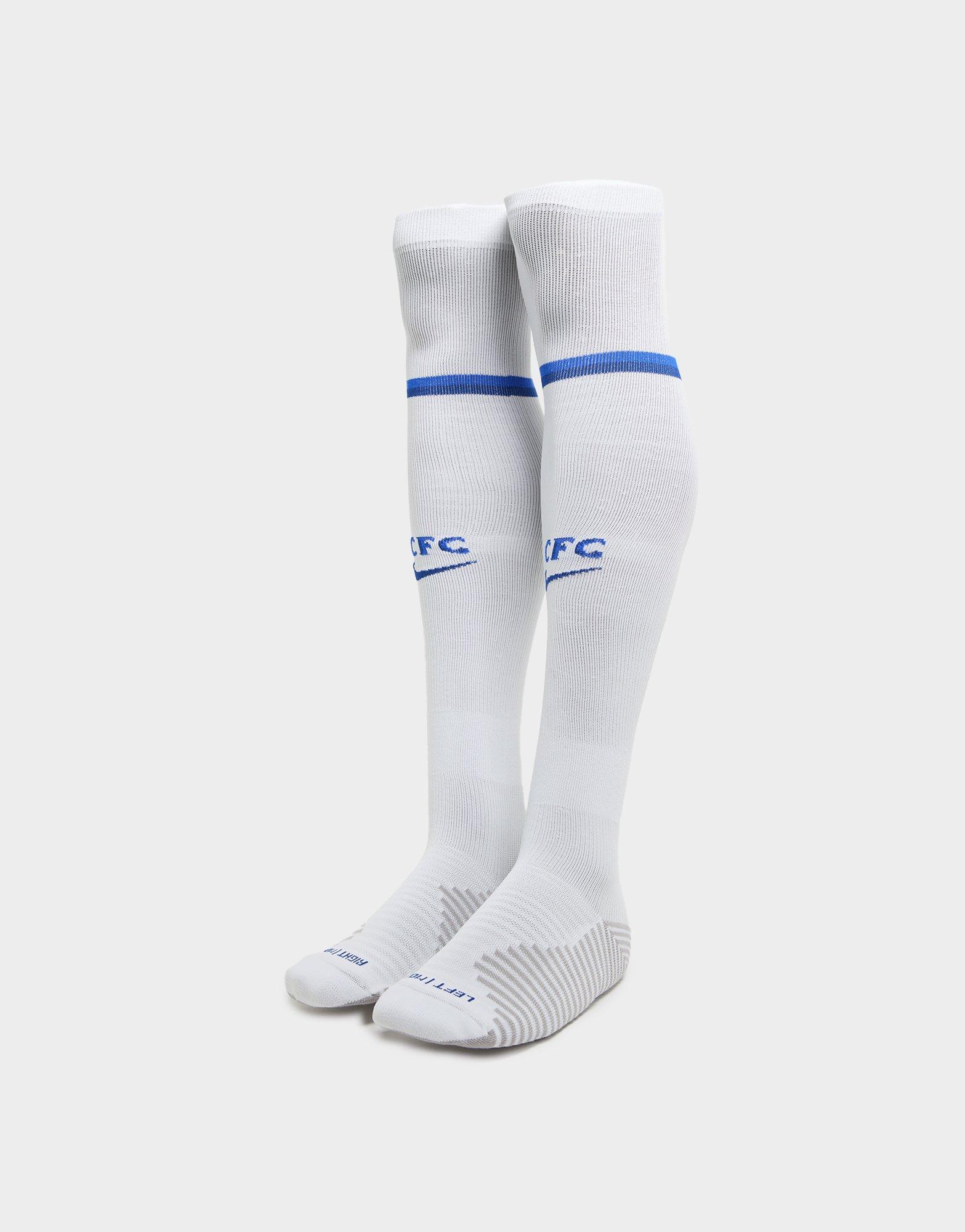 Show support for the team on the pitch with this men's Chelsea FC 2025/26 Home Socks from Nike. In a White colourway with Hyper Royal and Rush Blue accents, these socks are made from smooth, stretchy fabric for lasting comfort. They feature DRI-FIT sweat-wicking tech to keep things cool when the game heats up, and hug your leg to the knee for a secure it. Finished up with CFC and Swoosh branding. Machine washable.