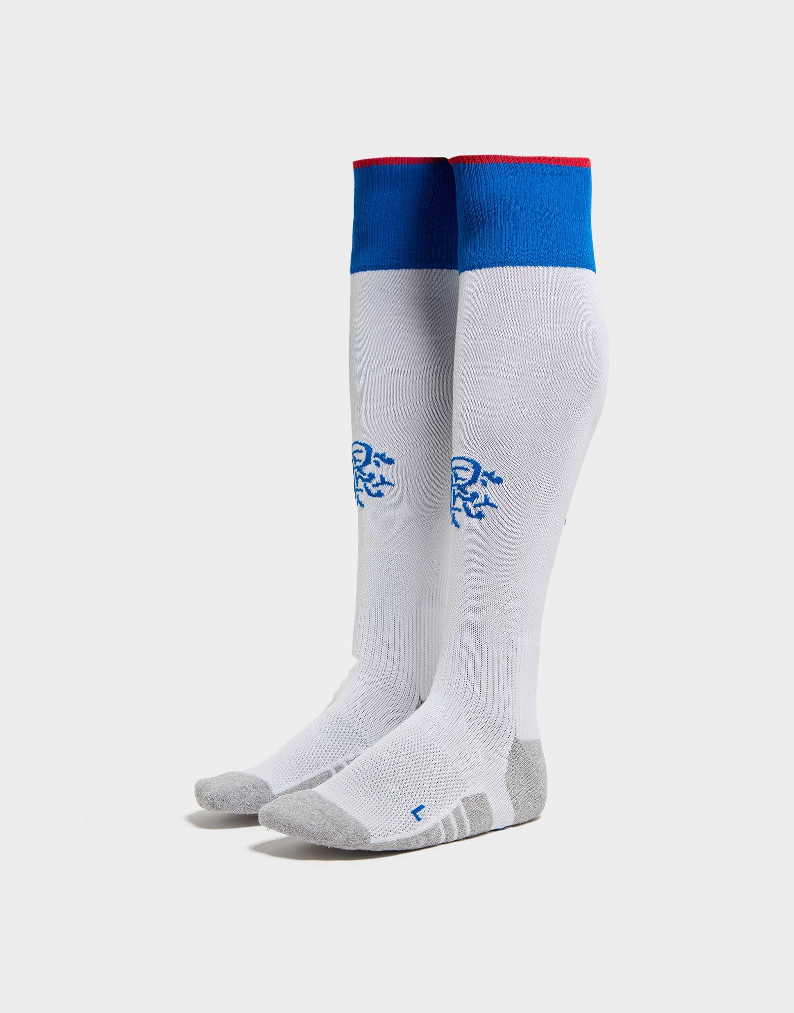 Back the Gers on the pitch. These juniors' Rangers FC 2025/26 Away Socks from Umbro are cut from smooth, part-recycled fabric. They're light and stretchy, with precision cushioning at the heel and footbed to amp up the comfort. In Brilliant White, they're finished with Lapis Blue Umbro and Rangers branding. Machine washable.